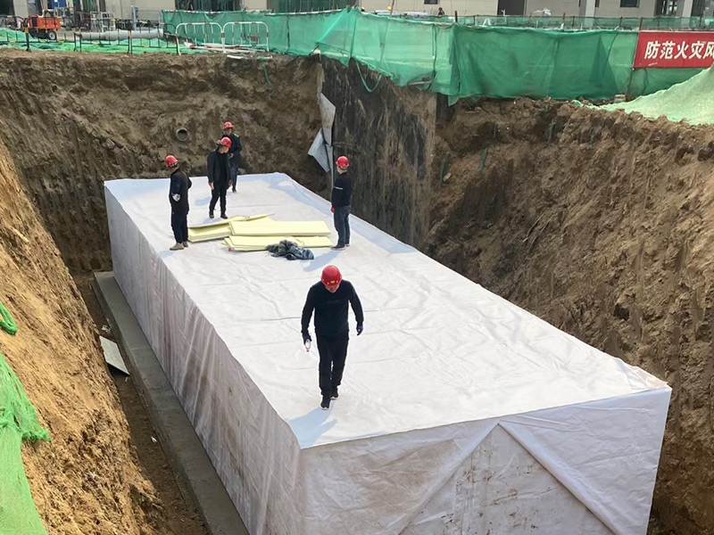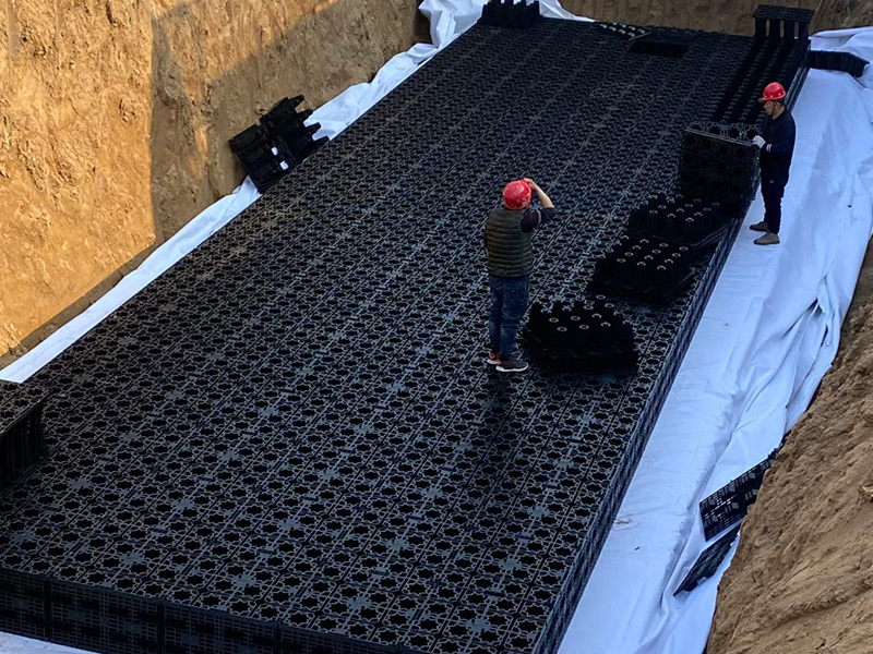 在安裝之前需夯實基礎鋪好透水沙墊層,鋪好透水土工布,然后將PP透水模塊放置在土工布之內,使用土工布將模塊包裹好后進行回填工作。一般在滲透水池進水管上需設置截污掛籃、棄流過濾裝置的設備,以防止較大的垃圾物進入滲透水池。